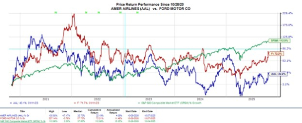 Taking a longer view, Ford stock is sitting on gains of +70% in the last five years, which has topped American Airlines’ +20% although both have lagged the benchmark S&P 500’s return of more than +100%.