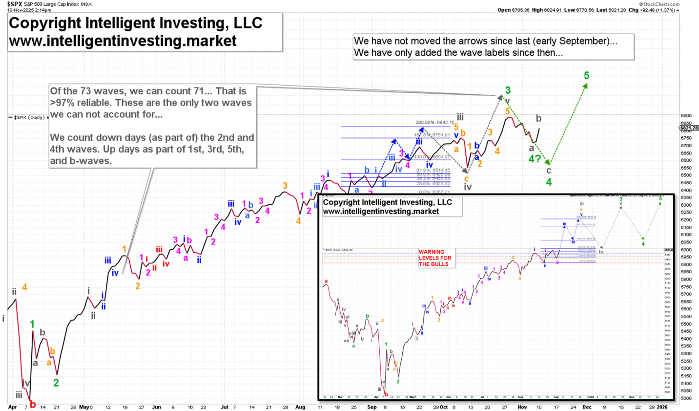Furthermore, last week’s closing low at 6720 also aligns well with the projected green W-4 low from over two months earlier. Therefore, our overall Elliott Wave path since early September continues to track the market. Additionally, the index only reached 6920 instead of 7120, which is a 200-point (2.8%) miss, and somewhat significant, as stock markets tend to be more accurate than that. However, since 4th waves often form complex patterns, meaning they can develop into an extended (gray) W-a, -b, and -c, we cannot be certain it has finished yet. As a result, last Friday’s low could have been W-a of W-4.